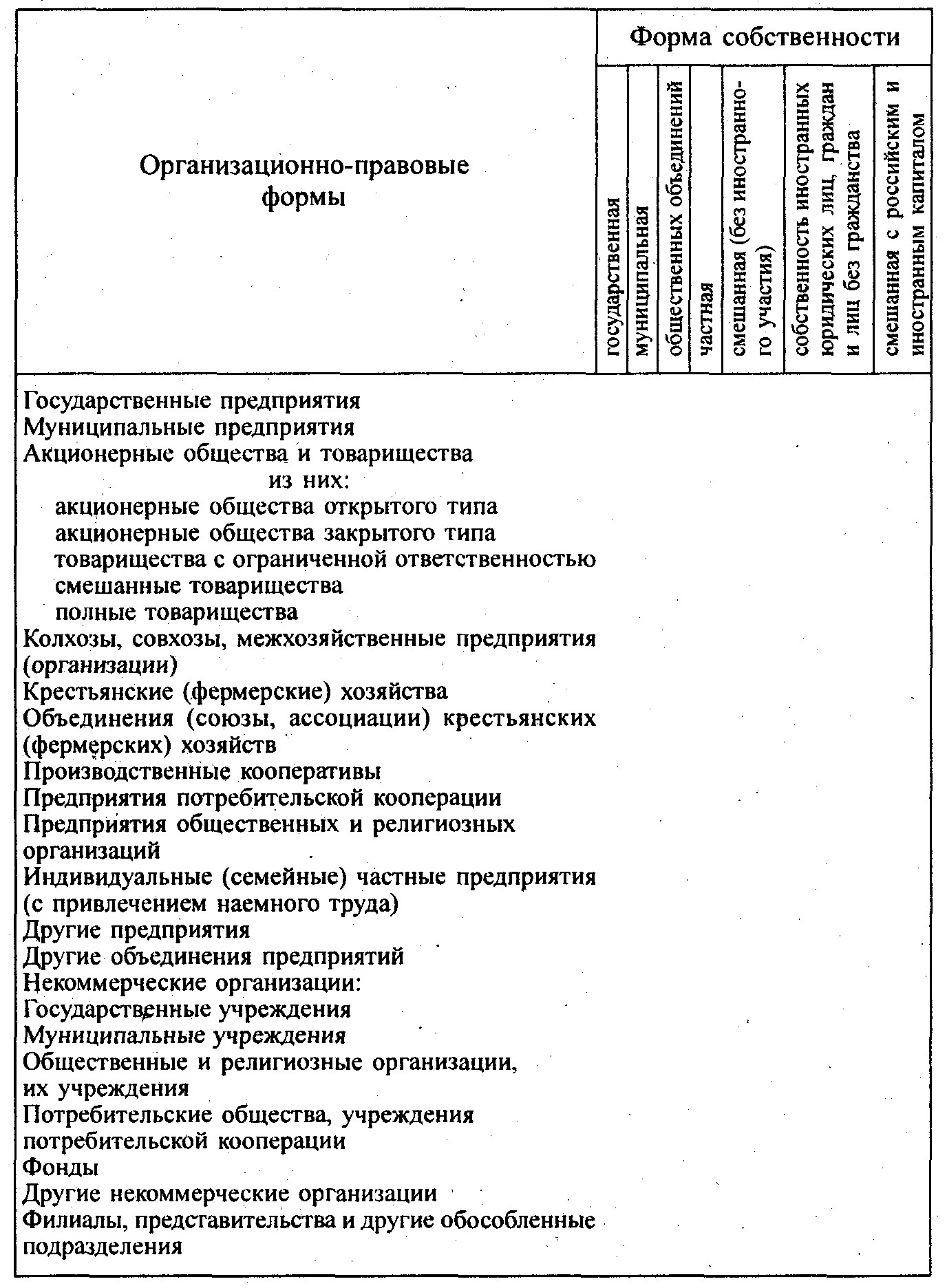Для изучения структурных изменений в экономике государственная статистика использует группировку хозяйственных субъектов по формам собственности и организационно-правовым формам, представленную в табл. 6.1.